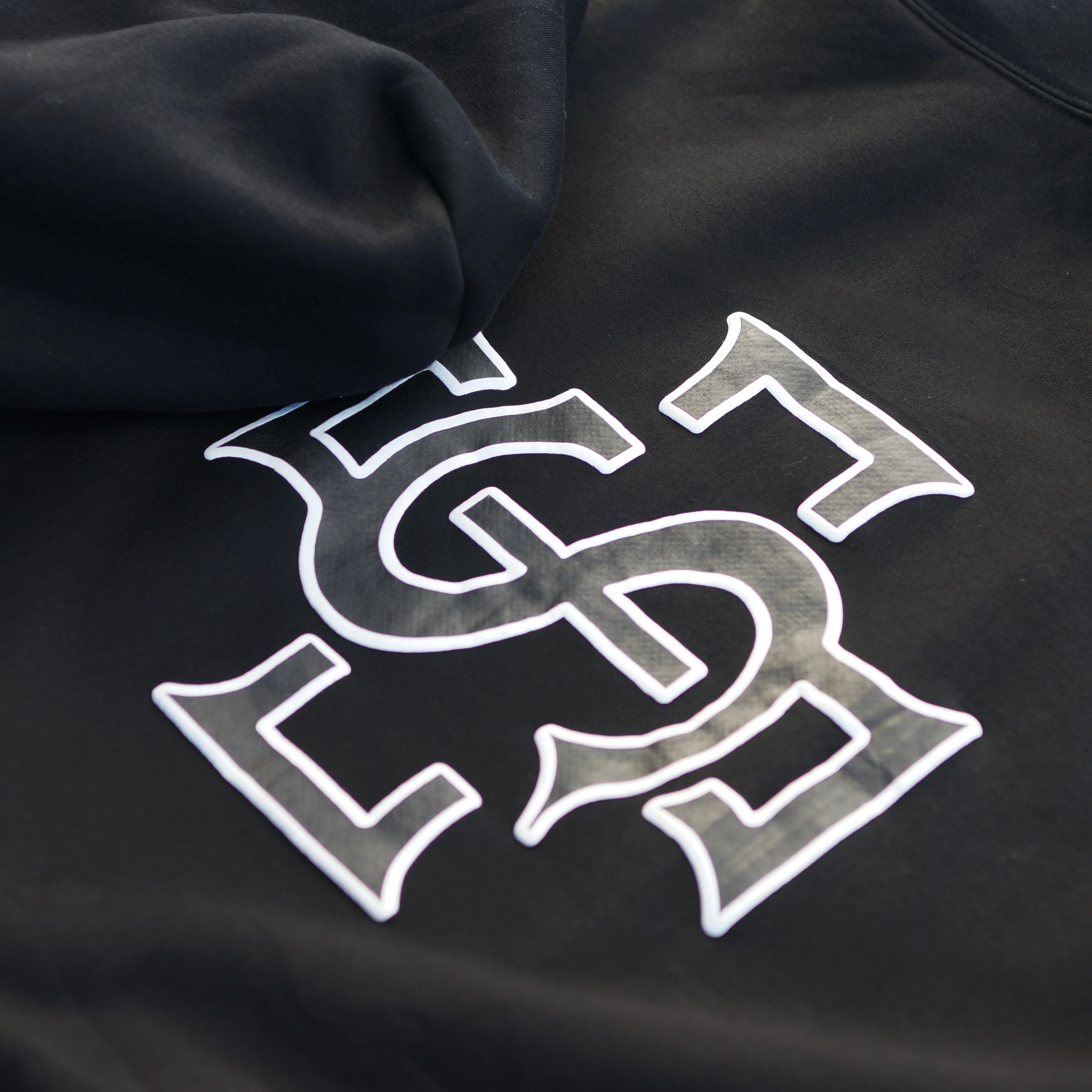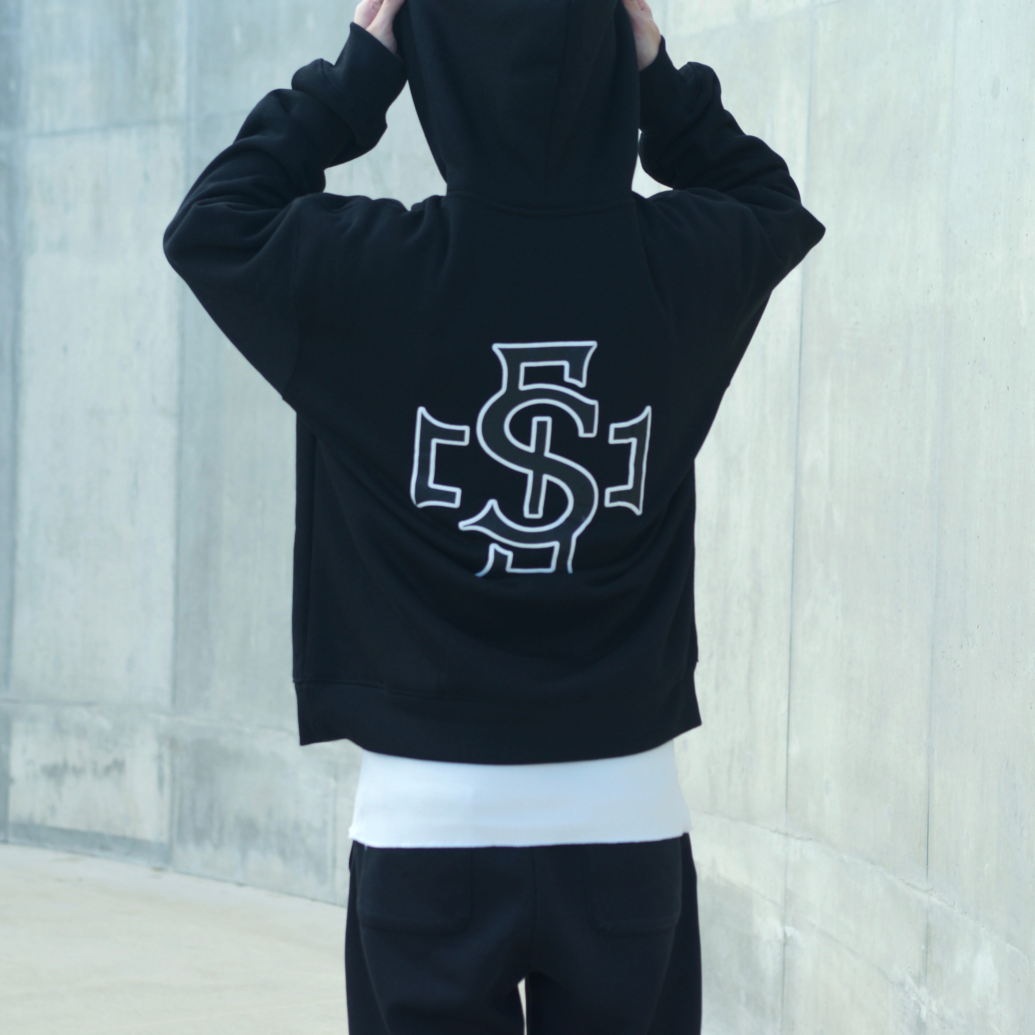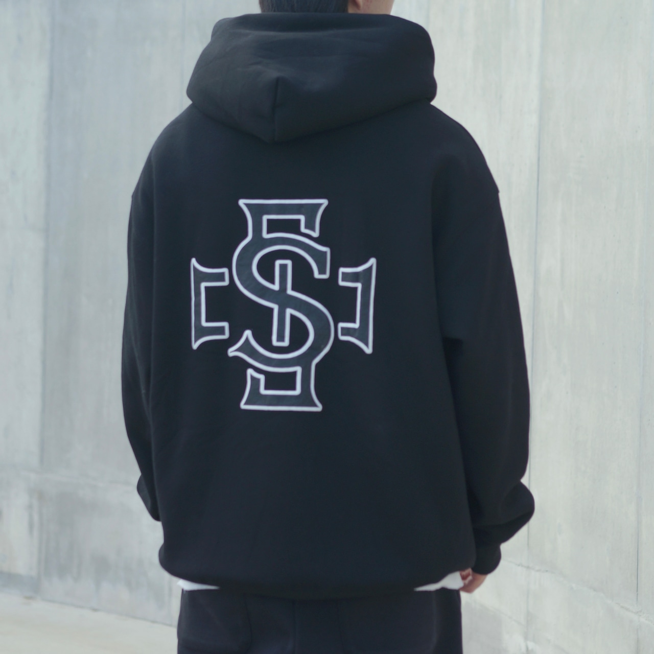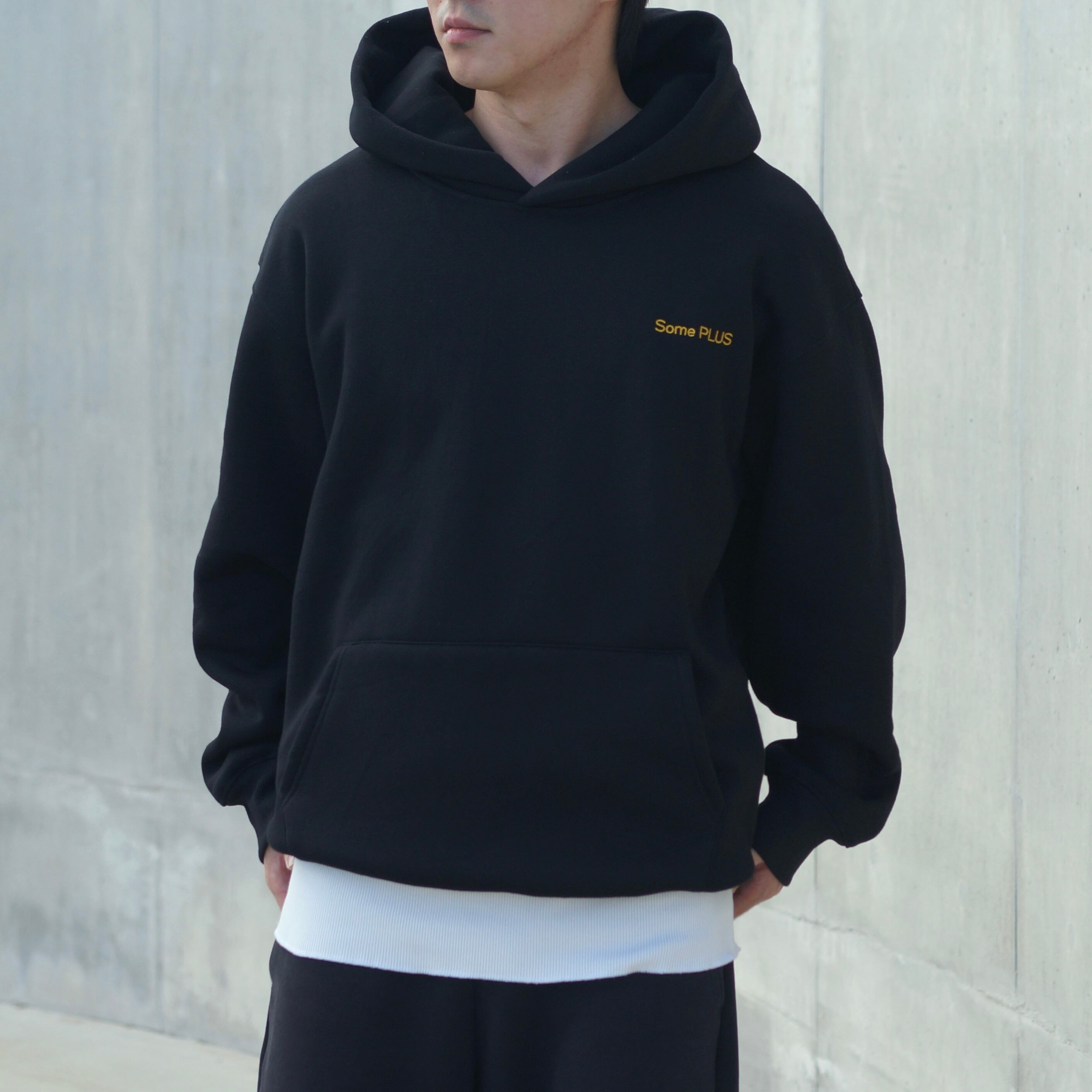 ゴールド刺繍が引き締めてくれるので、黒フーディーでも重たく見えません。